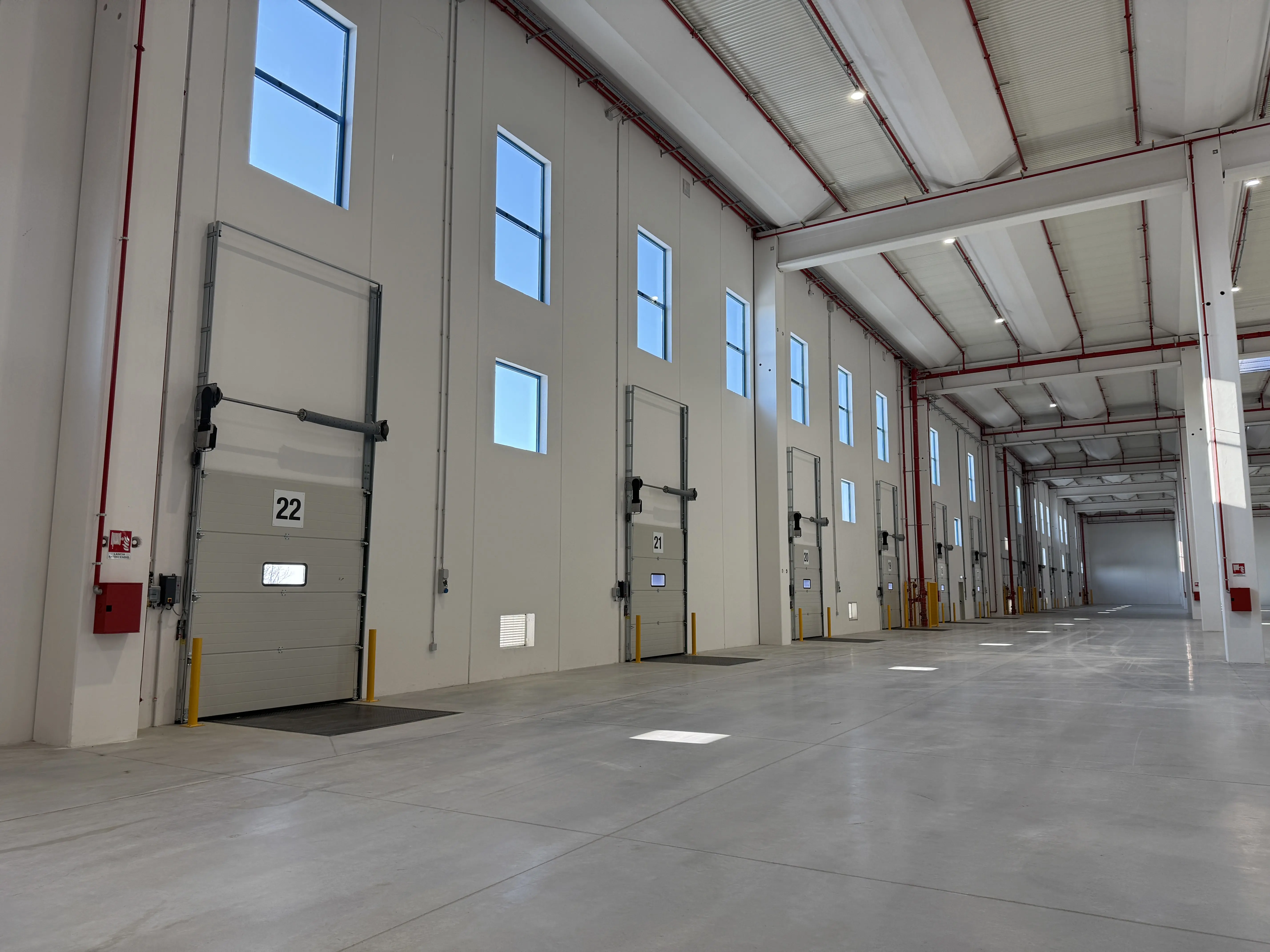 In costruzione capannone antisismico REI 120 - LEED GOLD di 23.616mq a magazzino oltre vano caricabatterie e 774mq di uffici e spogliatoi su due piani, in aggiunta soppalchi di 2.436mq, altezza 12,40m; illuminazione a LED, impianto antincendio con manichette UNI 45 interne, idranti esterni UNI 70 e Sprinkler NFPA/ESFR, 26 baie di carico,2 portoni a raso, parcheggi auto/tir. CONSEGNA Q3-26