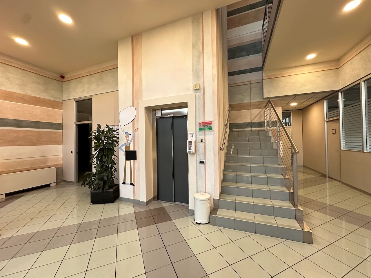 Situato in palazzina direzionale, ufficio posizionato al primo piano con ascensore, composto da reception al piano terra, hall di ingresso al piano primo, sala riunioni, 2 uffici open space, 2 servizi con antibagno e archivio. Parcheggio su strada e 7 posti auto coperti in garage openspace.